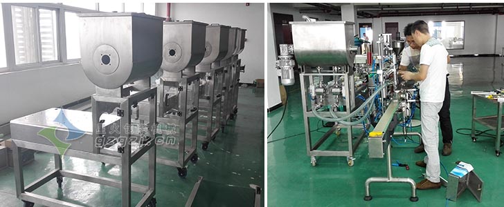 3、該灌裝生產(chǎn)線配置兩個(gè)灌裝頭,同步工作,效率高,醬料可均勻地被擠壓灌裝到容器里。